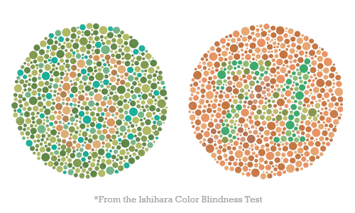 Featured image: The image above features two Ishihara color blind tests. They look like circles with many different colored dots, and supposedly, someone who is not color blind can see a number in the dots. Although I cannot see the numbers, I have always enjoyed how these circles look.